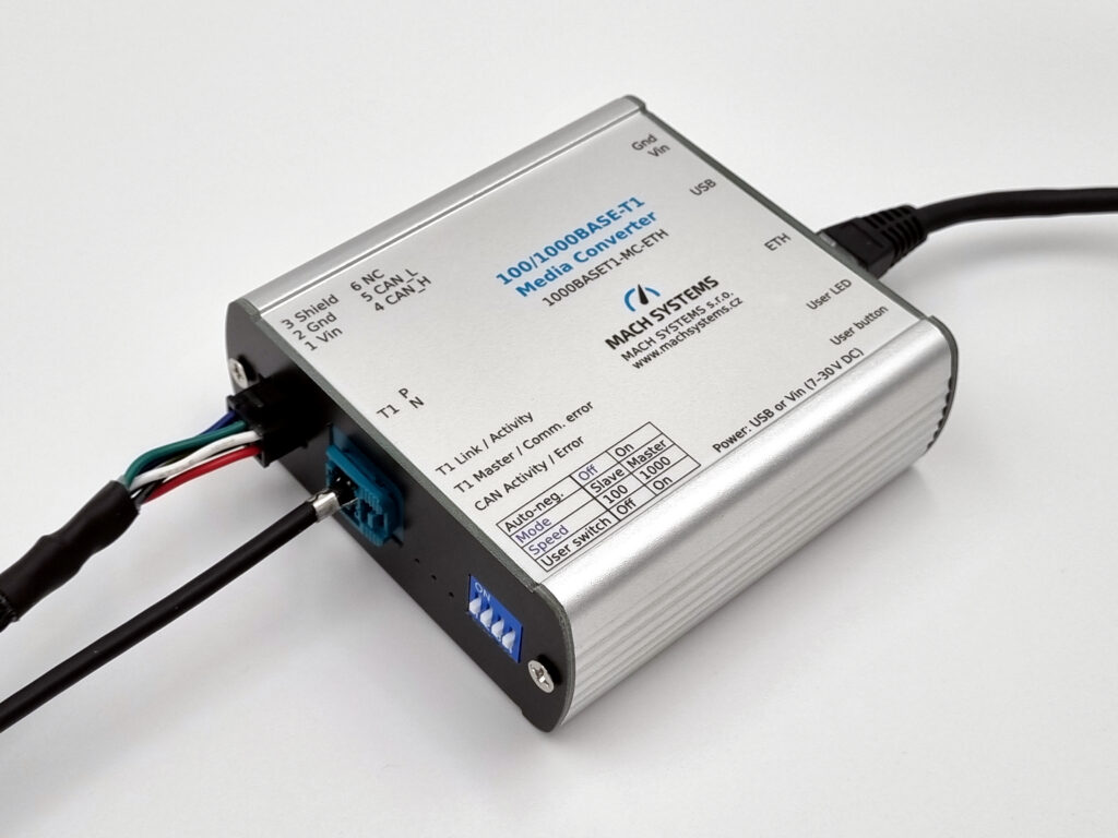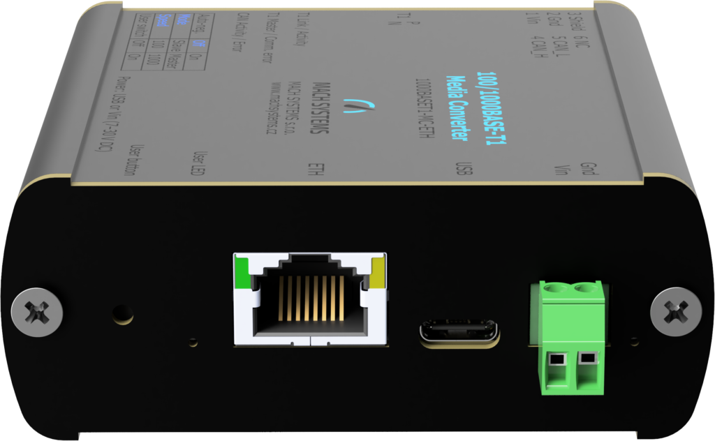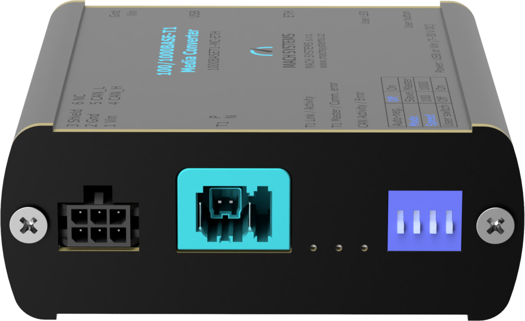 100/1000BASE-T1 メディアコンバータMATEnet(H-MTD)は、1000BASE-T1 と1000BASE-T (ギガビットイーサネット)、または100BASE-T1 と100BASE-TX (ファストイーサネット) ネットワーク間の全二重物理層変換を実現し、TE MATEnet(Rosenberger H-MTD)およびRJ-45 コネクタを備えています。通信速度とマスター/スレーブの設定は、リンクパートナーと自動ネゴシエートするか、ユーザーが手動で設定できます。USBポート(VCP)を使用して、デバイスのステータスを読み取り、ポートを診断できます。このデバイスは、USB-CAN(/FD)インターフェイスとしても使用できます。