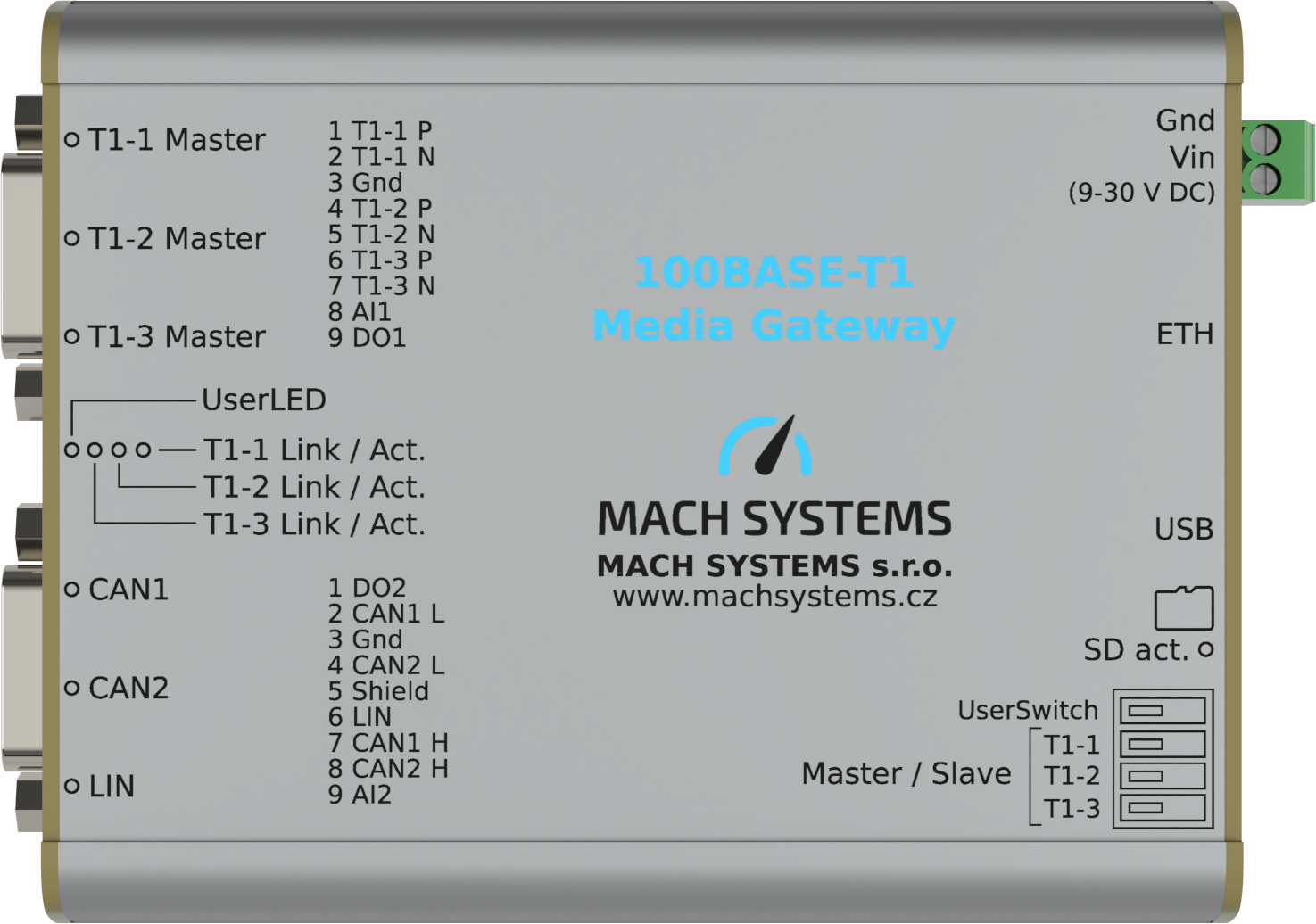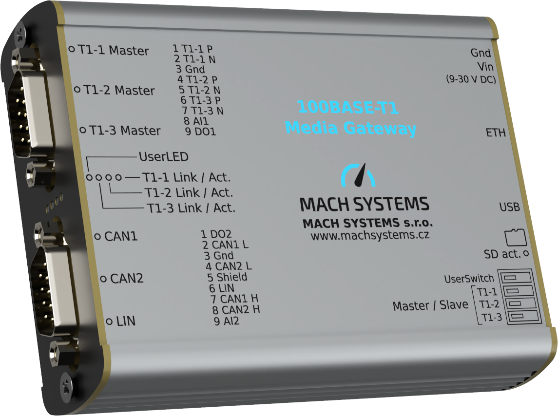100BASE-T1メディア・ゲートウェイは、構成可能な車載イーサネット・スイッチおよび通信ブリッジです。このデバイスは、パケット転送機能を採用したフレームスニファ(アクティブTAP)や、イーサネット-CAN(/FD)ゲートウェイとして使用でき、任意のイーサネットポートとCANまたはCANFDネットワーク間でデータを双方向に受け渡すことができます。このゲートウェイは、3つの100BASE-T1ポート、1つのギガビットイーサネット(1000BASE-Tまたは10/100BASE-TX)ポート、2つのCAN(/FD)チャネル、LINバス、およびUSBポートを備えています。すべてのイーサネットポートは、スイッチ回路に内部接続されています。microSDカードスロット、2つのデジタル出力、2つのアナログ入力も利用可能です。無償のC言語SDKにより、ユーザーは監視/スニッフィング、テスト、シミュレーション用のカスタムデバイスファームウェアを開発できます。