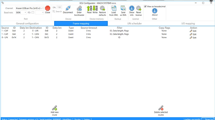 ECUConfigurator(製品番号:GW-ECU-CONFIG-TOOL)PCアプリケーションを使用すると、CANバスを介してECUを簡単に構成できます。ECUのモード、通信チャネルのパラメータ、チャネル間フレーム変換(フレームマッピング)、I/Oマッピングの設定が可能です。構成は、デバイスの不揮発性メモリに保存されます。