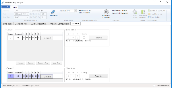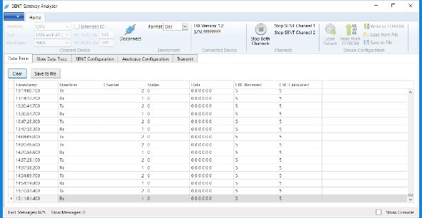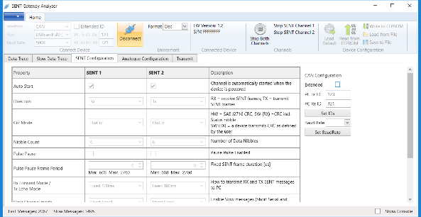 デバイスの設定や、SENT通信の監視、ロギング、シミュレーションを行うPCアプリケーション「SENTGatewayAnalyser」を無料で提供しています。このデバイスは、RS-232/CANを介した通信プロトコルを提供するため、ユーザーはデバイスをテストベンチ、HiLリグ、エンドオブラインテスターなどの既存のシステムに容易に統合できます。このプロトコルは、デバイスのSENTチャネルとアナログチャネルを構成し、SENT高速および低速メッセージを送受信する機能を提供します。Fastメッセージと Slowメッセージの両方への CRCフォールト挿入も可能です。