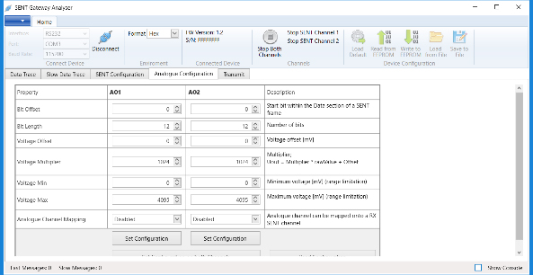このコンバータは、2つのアナログ出力チャンネル(12ビットDAC)を備えており、これを使用して、受信SENTデータフレームをアナログ電圧に直接変換できます。アナログ出力チャンネルは、任意のSENTチャンネルにマッピングできます。また、変換パラメータは完全に構成可能です:StartBit、BitLength、および線形伝達関数:Multiplier、Offset、Min/Max。