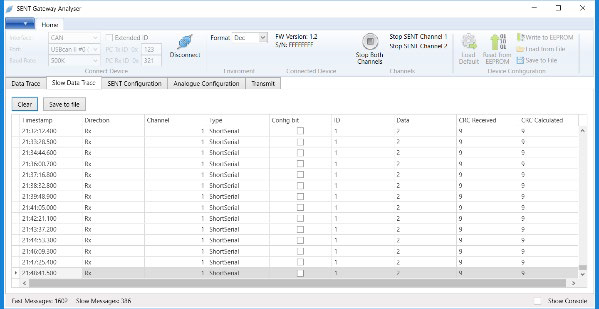 RS-232またはCAN通信が過負荷にならないように、受信SENTフレームのインテリジェントなフィルタリングが導入されました。CANバリアントは、TXとRXの両方に対して設定可能なCAN識別子を提供し、同じCANバス上で複数のデバイスを同時に使用できます。デバイスのファームウェアはPCからアップグレードできます。